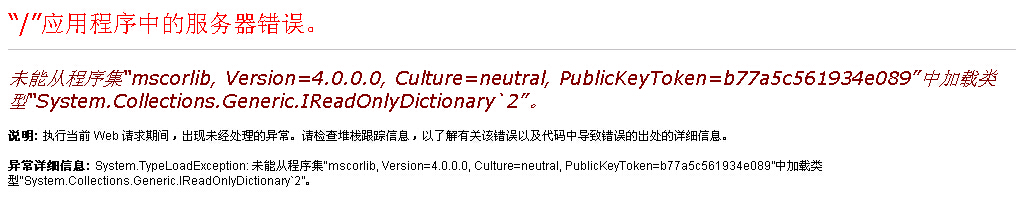 异常详细信息: System.TypeLoadException: 未能从程序集“mscorlib, Version=4.0.0.0, Culture=neutral, PublicKeyToken=b77a5c561934e089”中加载类型“System.Collections.Generic.IReadOnlyDictionary`2”。