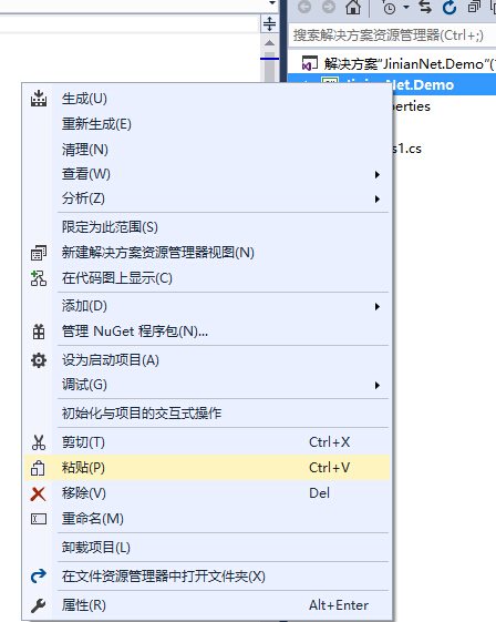 在VS2013中,直接在解决方案/项目上右键,选粘贴或直接CTRL+V,即可将整个文件夹及子文件夹、文件复制到解决方案中。