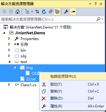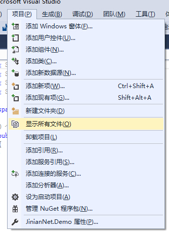 不过,如果出现这种情况,我们可以点项目 -> 显示所有文件,就可以在解决方案中看到所有文件与子文件夹,但是图标以虚线显示以表示未包含在项目中。